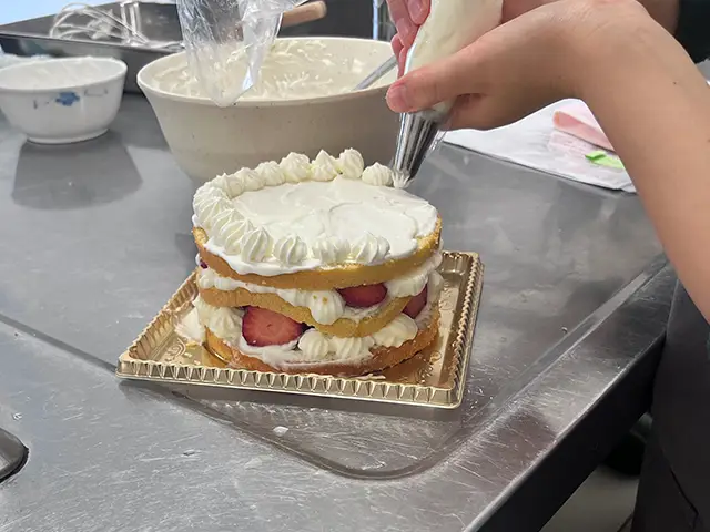 ホールケーキが出来上がったら、最後の仕上げとして、美しいデコレーションのテクニックや知恵を、プロフェッショナルが直伝します。ふわふわ食感にこだわった、美味しいケーキが完成する予定です。お持ち帰り用に、ショートケーキの箱もご用意します。